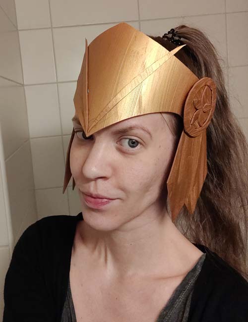 The final version, made of EVA foam, was shaped into a helmet framing my face. It was glued and sewn together, held on by a rubber band around my head secured with hair clips under the visor, and the cheek pieces fixed with clothing tape. The homemade “helmet” met all functional criteria and stayed securely on through every performance.