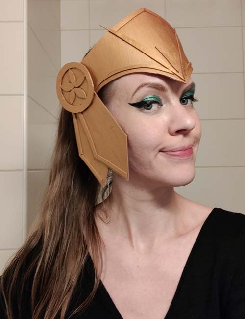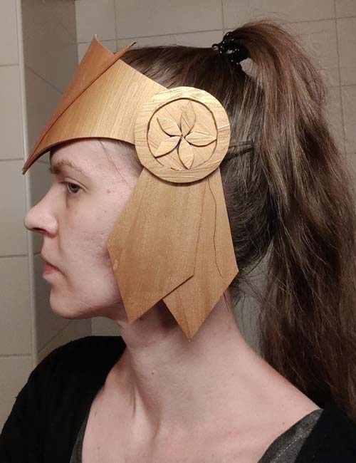 The final version, made of EVA foam, was shaped into a helmet framing my face. It was glued and sewn together, held on by a rubber band around my head secured with hair clips under the visor, and the cheek pieces fixed with clothing tape. The homemade “helmet” met all functional criteria and stayed securely on through every performance.