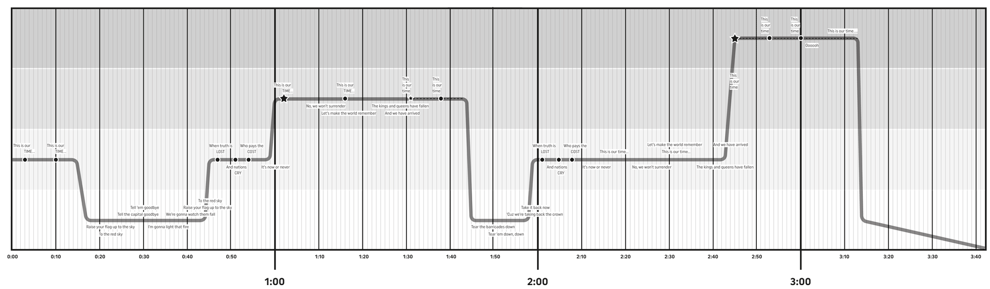 - I divided the song into sections, noting how the drama rose and fell to guide the overall arc.